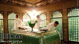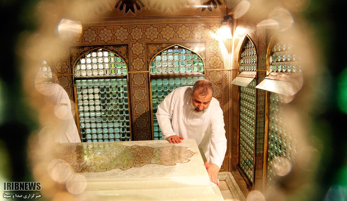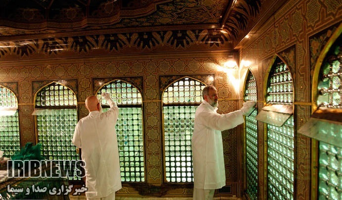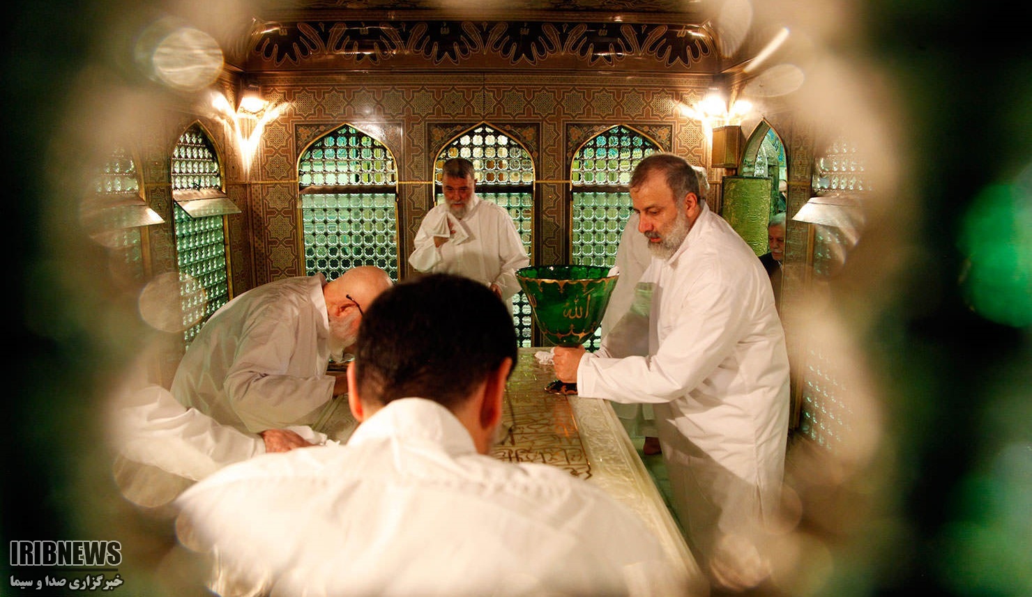 مشبک ها و فضای داخل ضریح، سنگ مضجع حضرت رضا (ع) را با گلاب شست و شو دادند.