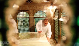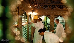 محلاتی و علی واعظ طبسی به ضریح مطهر ثامن الائمه (ع) وارد شدند و ضمن غبار روبی