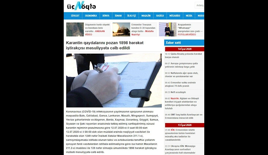 - در ۲۴ ساعت گذشته ۱۸۹۸ نفر در جمهوری آذربایجان به علت نقض مقررات قرنطینه، جریمه و مجازات شده اند.