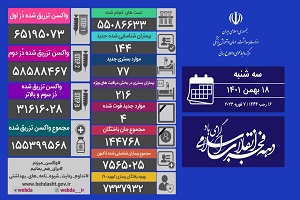 از دیروز تا امروز ۱۸ بهمن ماه ۱۴۰۱ و بر اساس معیارهای قطعی تشخیصی، ۱۴۴ بیمار جدید مبتلا به کووید۱۹ در کشور شناسایی و ۷۷ نفر از آنها بستری شدند.