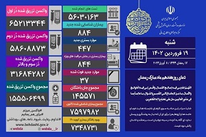به گزارش خبرگزاری صدا و سیما و به نقل از وبدا، متن این اطلاعیه به شرح زیر است: «تا کنون ۶۵ میلیون و ۲۱۳ هزار و ۳۴۴ نفر دُز اول، ۵۸ میلیون و ۶۰۸ هزار و ۸۷۳ نفر دُز دوم و ۳۱ میلیون و ۶۸۴ هزار و ۲۸۲ نفر، دُز سوم و بالاتر واکسن کرونا را تزریق کرده اند و مجموع واکسن‌های تزریق شده در کشور به ۱۵۵ میلیون و ۵۰۶ هزار و ۴۹۹ دُز رسید.