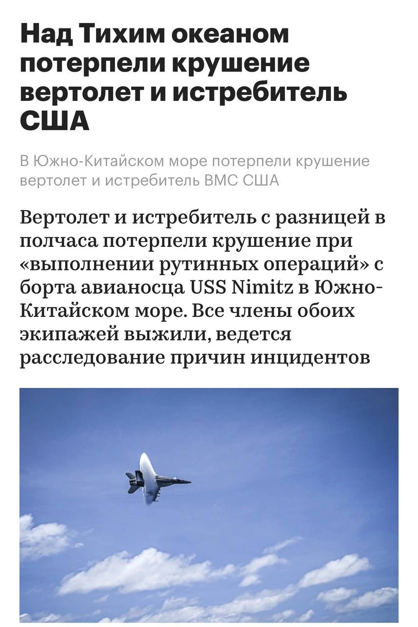 - سقوط و انهدام یک بالگرد و یک جنگنده نیروی دریایی آمریکا در دریای جنوبی چین