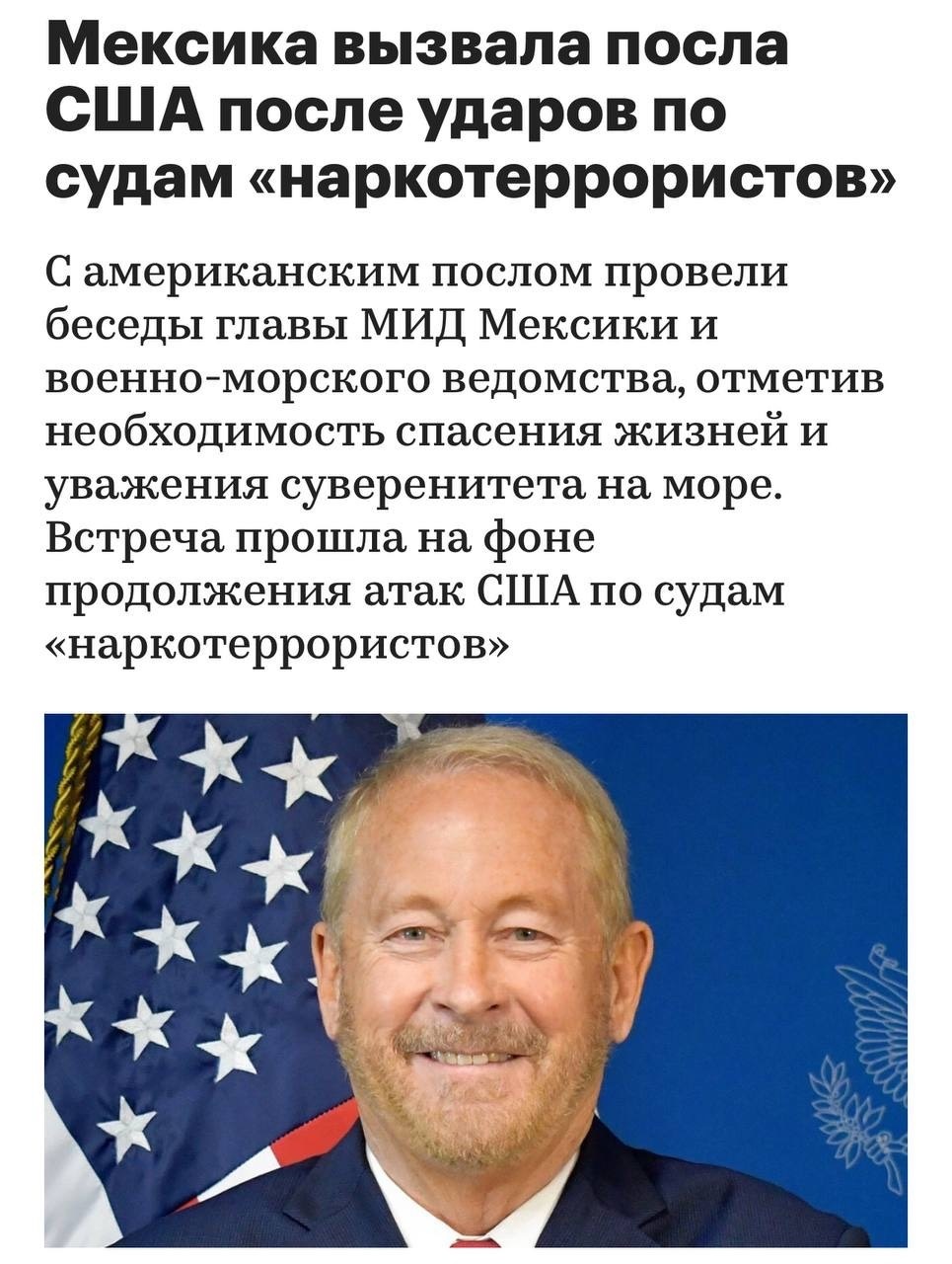 ⁃ مکزیک پس از حملات آمریکا به کشتی‌های صیادی ونزوئلا، که با ادعای «مبارزه با مواد مخدر»، انجام می‌شود، سفیر ایالات متحده را احضار کرد