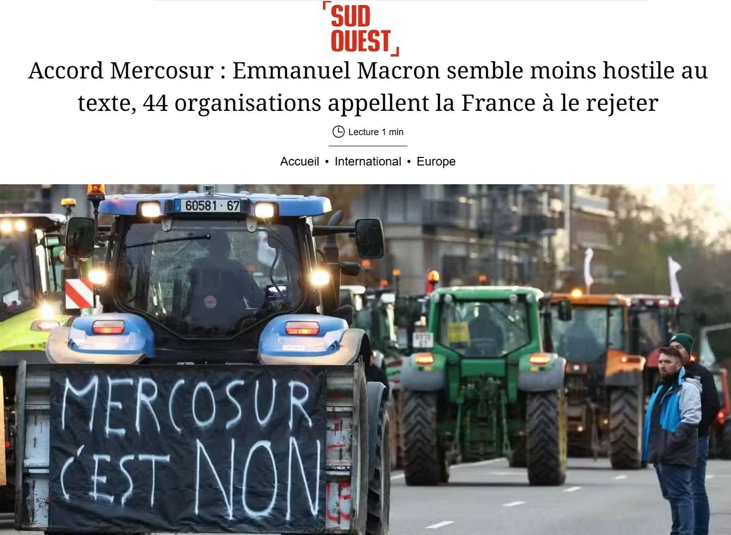 سود وست – توافق مرکوسور (پیمان تبادل تجاری اتحادیه اروپا و ۵ کشور آمریکای لاتین) و تغییر موضع و نرمش مکرون درباره متن توافقنامه؛ ۴۴ اتحادیه غیردولتی و سازمان غیردولتی شفافیت این موضع گیری را خواستار شده‌اند.
