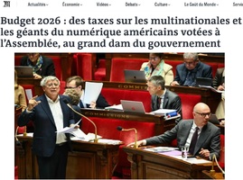 لوموند – بودجه ۲۰۲۶؛ مالیات‌های جدید بر شرکت‌های چندملیتی و غول‌های اینترنتی آمریکا در نخستین دور در مجلس به رای گذاشته شد. این مسئله نارضایتی دولت را در پی داشت. درآمد این مالیات‌ها ۲۰ میلیارد یورو است.