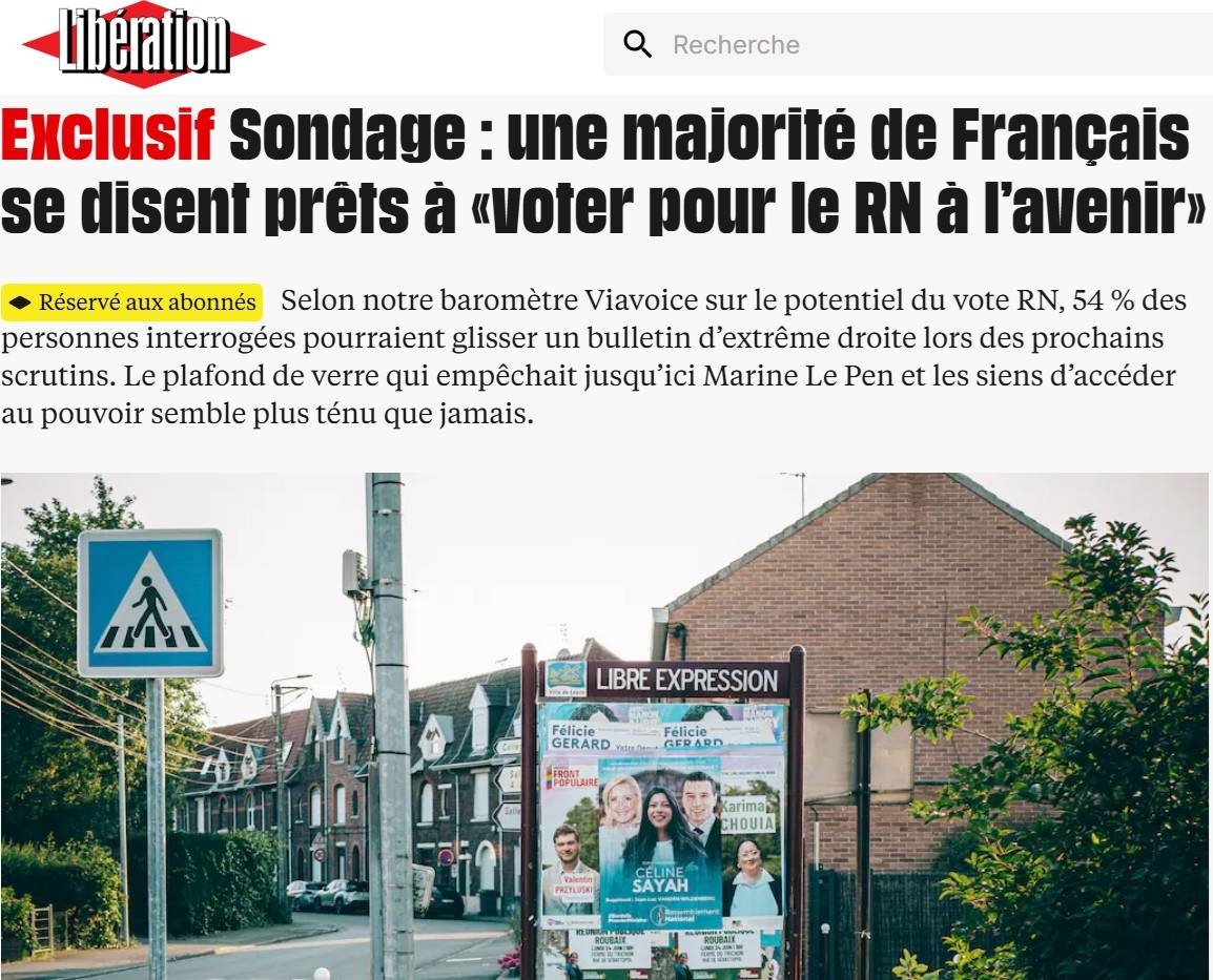 لیبراسیون – نظرسنجی انحصاری: بیشتر فرانسوی‌ها (۵۴ درصد) گفته‌اند در انتخابات ریاست جمهوری آینده به مارین لوپن و حزب او (تجمع ملی) رای می‌دهند.